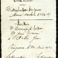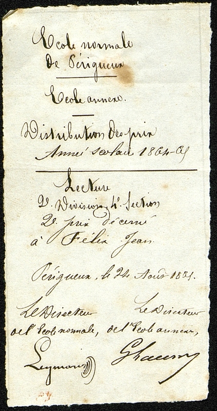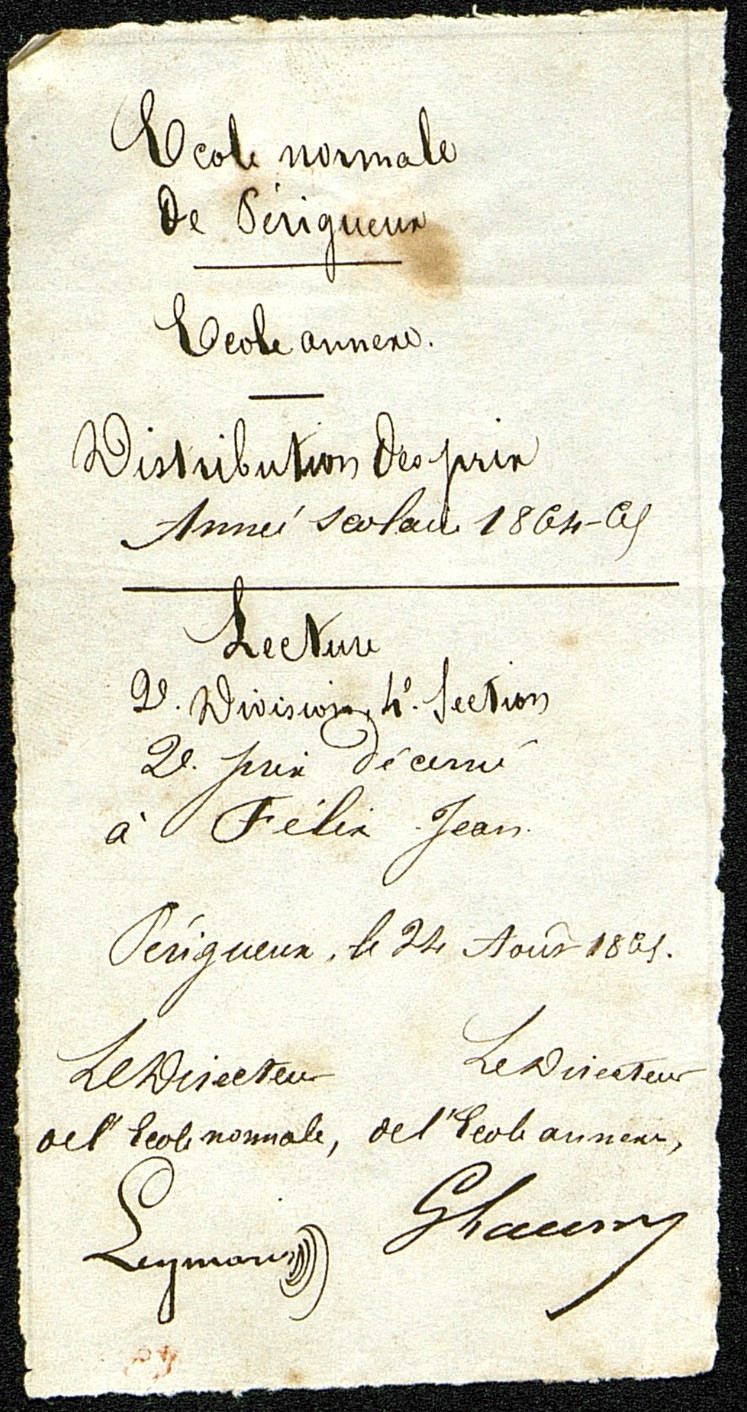 Document manuscrit de l'Ecole Normale de Périgueux. Lecture 2e Division, 4e Section, 2e prix décerné à Félix Jean.