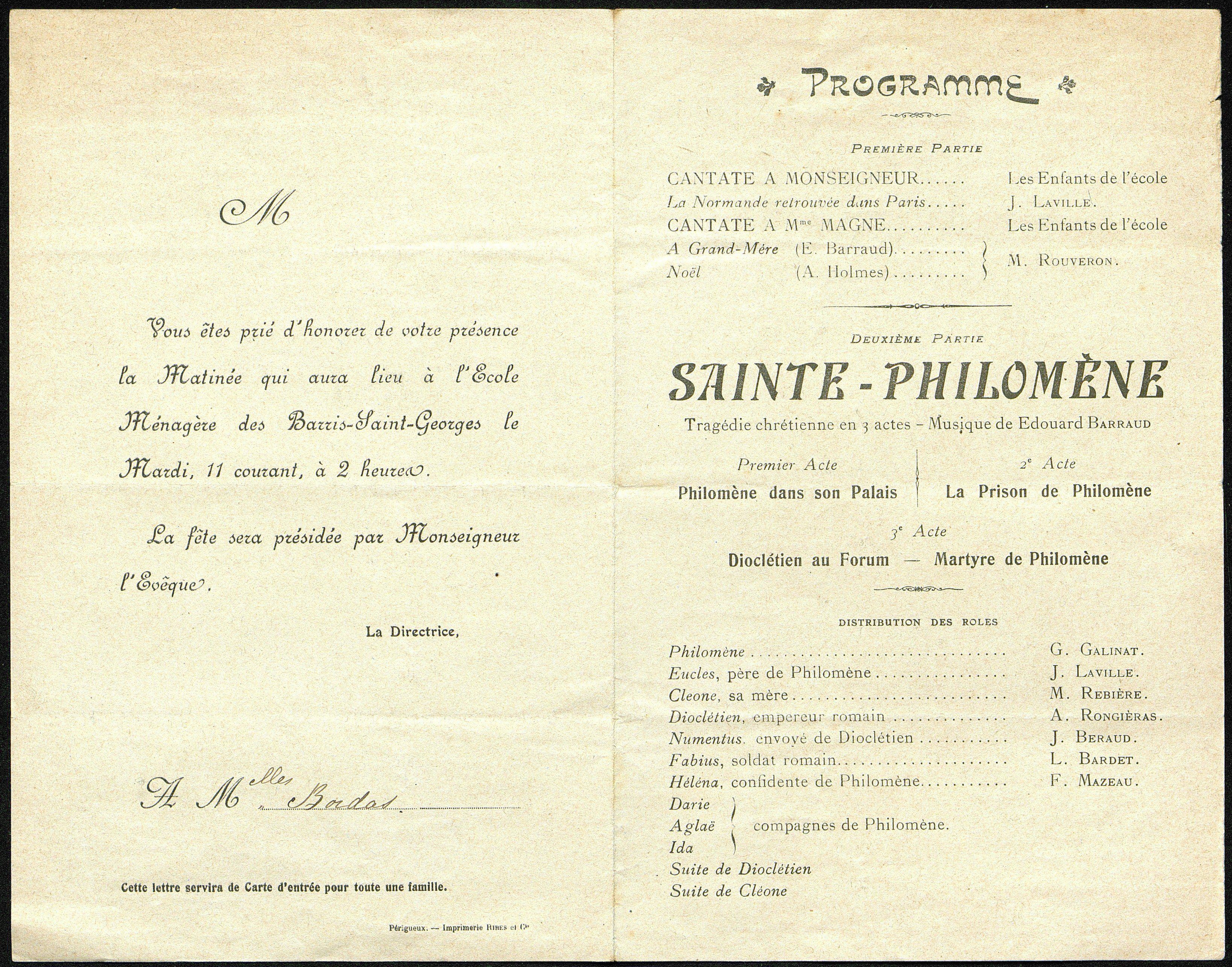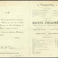 Deuxième page : programme en deux parties . Cantate à Monseigneur. La Normande retrouvée dans Paris. Cantate à Mme Magne. A ma grand-mère de Edouard Barraud. Noêl de Augusta Holmes. Sainte-Philomène tragédie chrétienne en trois actes.