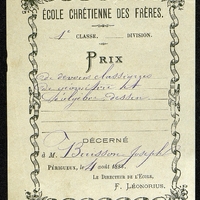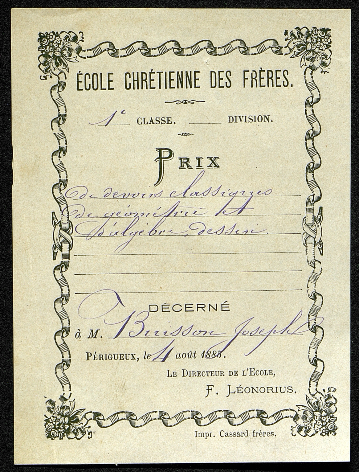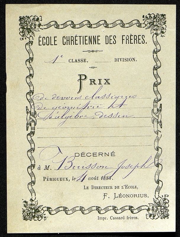 Ecole chrétienne des frères ; prix de devoirs classiques, de géographie et d'algèbre , dessin