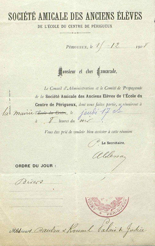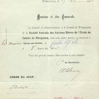 Invitation pour la Société Amicale des Anciens Eléves de l' Ecole du Centre de Périgueux du 15 décembre 1908