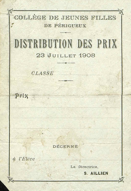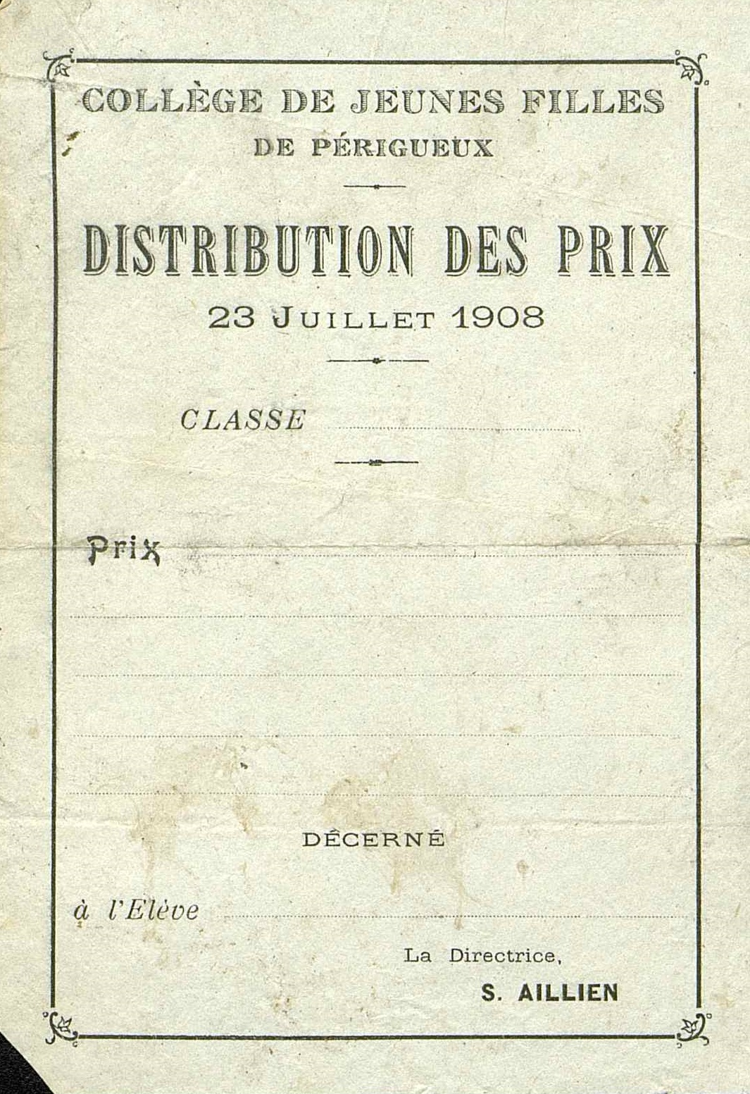 Bulletin vierge de distribution des prix du 23 juillet 1908 du Collège de jeunes filles de Périgueux