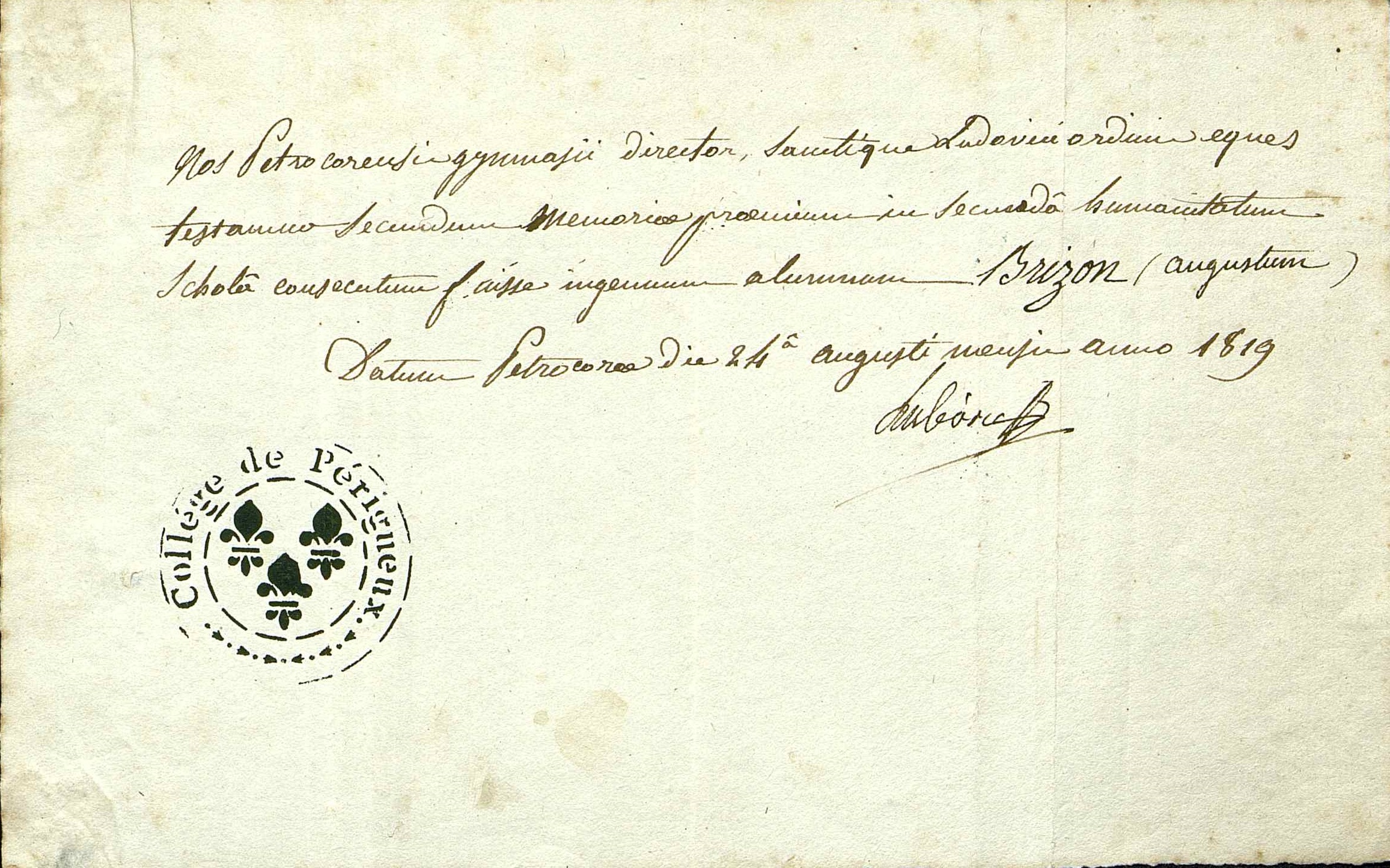 Prix de littérature décerné à Auguste Brizon. Tampon du collège de Périgueux aux trois fleurs de Lys