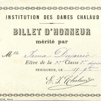 Institution des dames Chalaud à Périgueux. Billet d'honneur. 1885