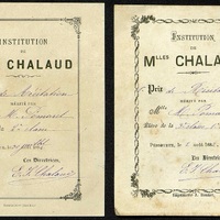 2 documents de l'Institution des demoiselles Chalaud pour des prix attribués à Mlle. Pomarel élève de la 3e classe, 1ère division. Deux prix de récitation, l'un de 1882, l'autre de 1884.