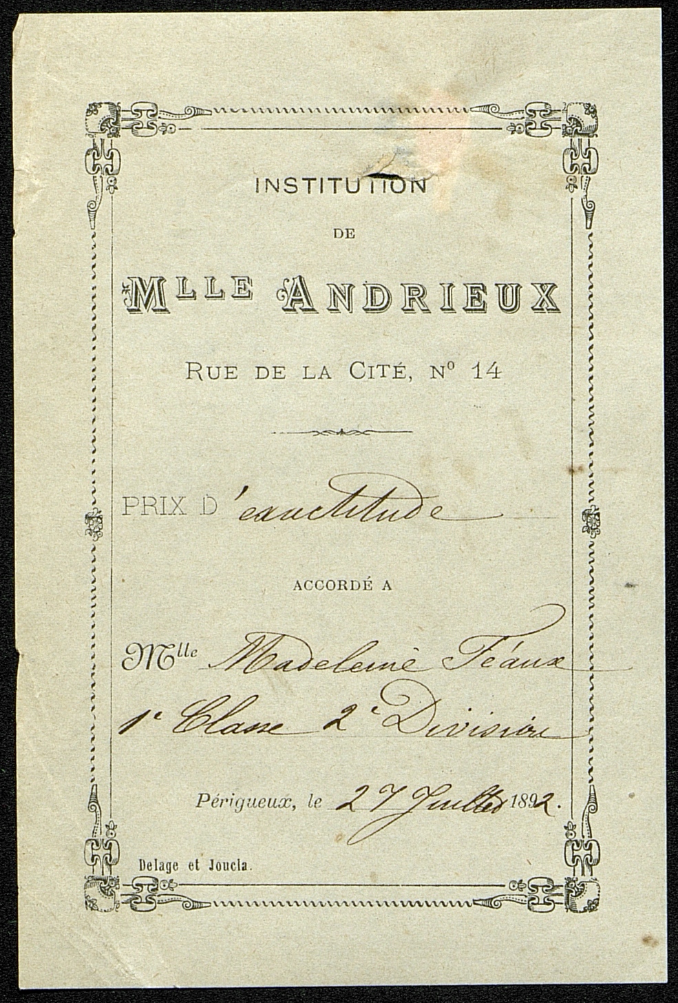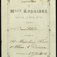 - Institution de Mlles Andrieux . Prix d'exactitude 1892 accordé à Mlle Madeleine Féaux.
