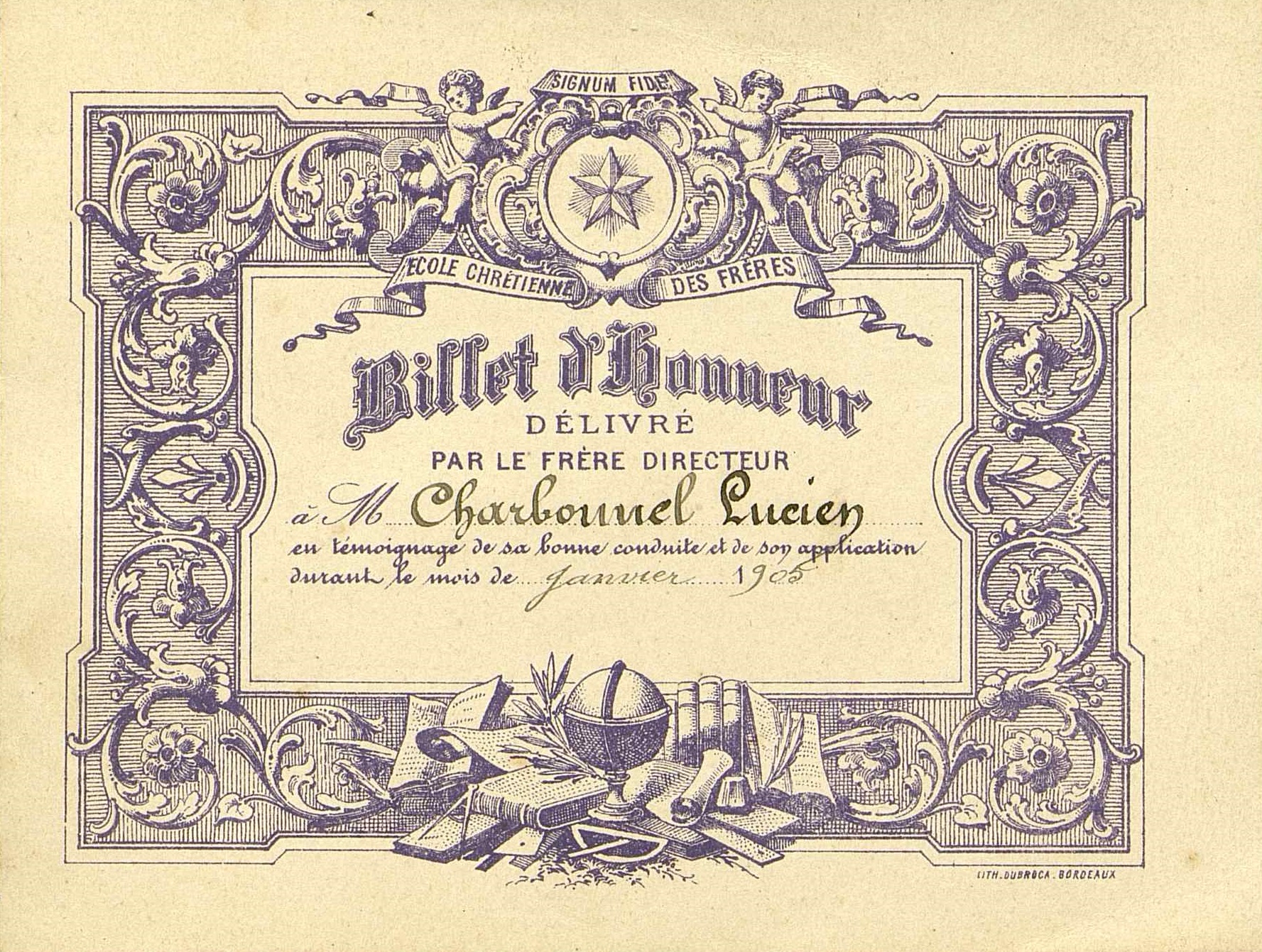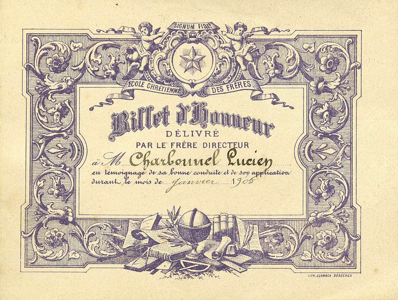 - Billet d'Honneur de bonne conduite délivré en 1905