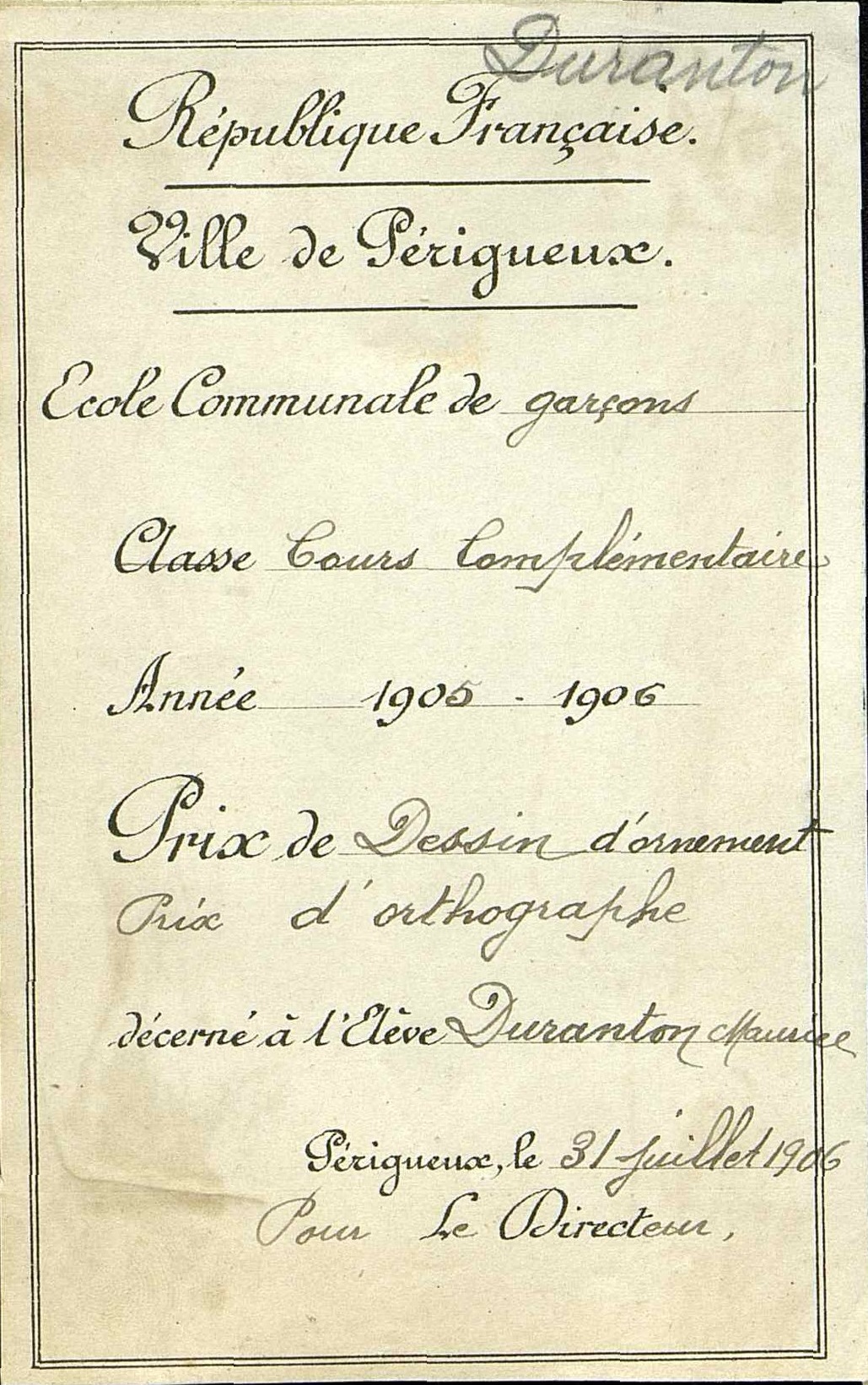 Prix de dessin d'ornement, prix d'orthographe décerné (sic) à l'élève Duranton Maurice