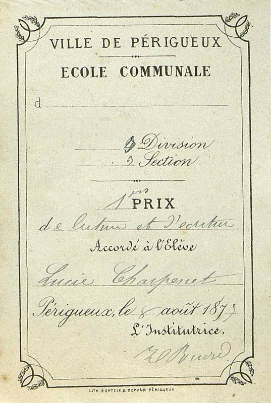 Récompense attribuée à l'élève Charpenet Lucie de l'Ecole Communale de Périgueux. 1er Prix en lecture et écriture décerné le 8 août 1875.