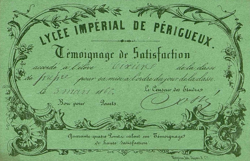 Lycée impérial de Périgueux. Témoignage de satisfaction. accordé à l'élève Tixier de la classe de prépa pour la mise à l'ordre du jour de la classe en 1866.