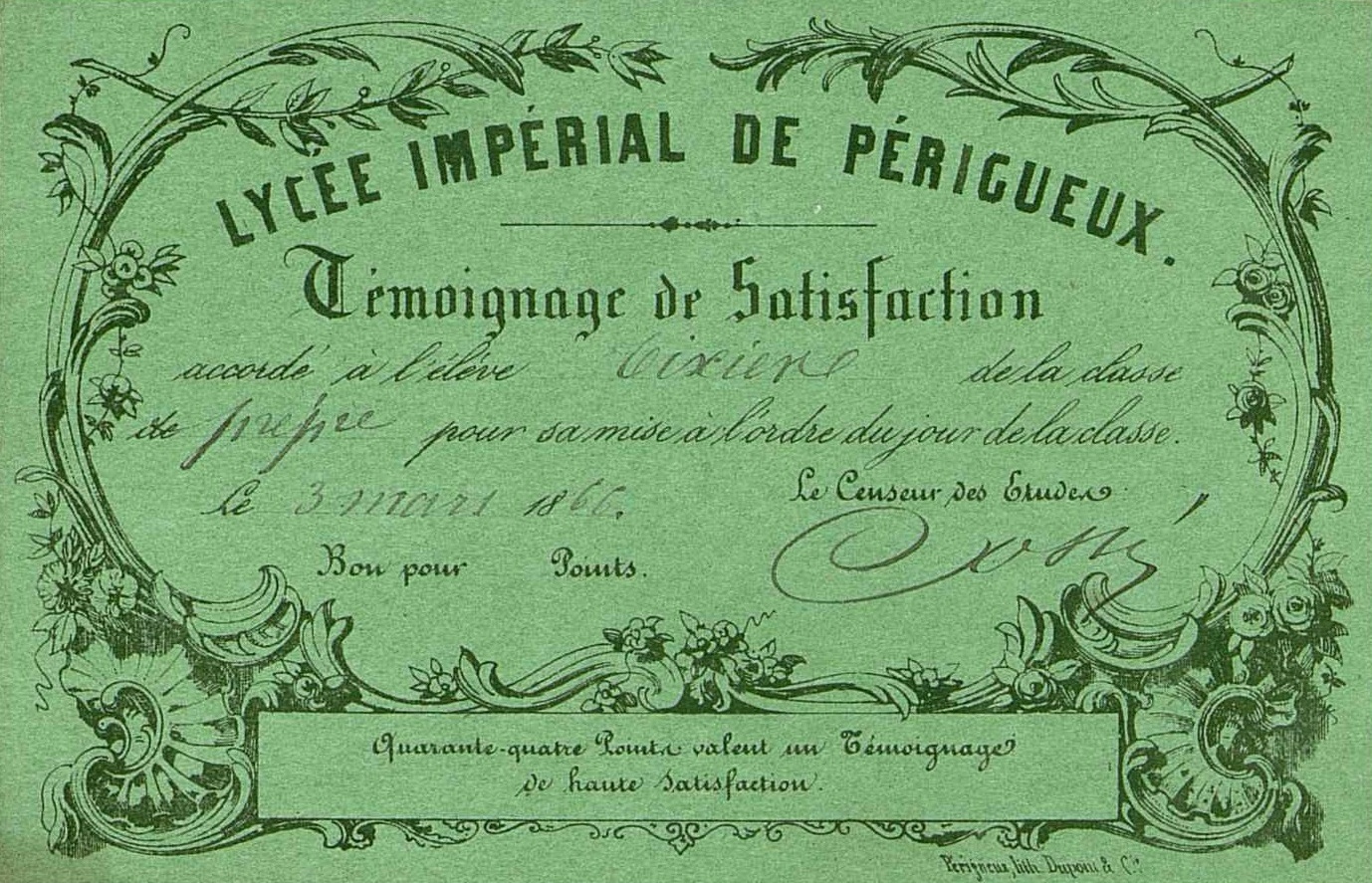Lycée impérial de Périgueux. Témoignage de satisfaction. 1866