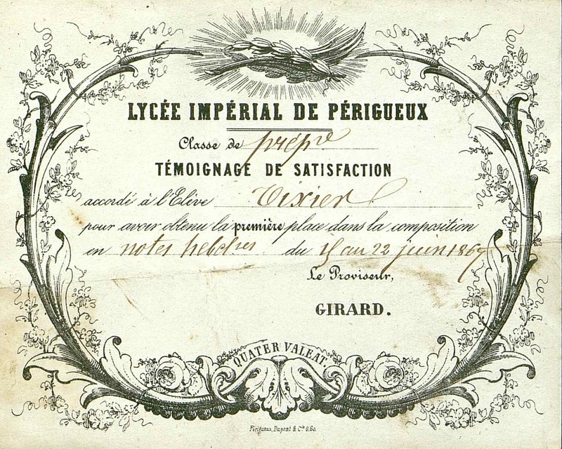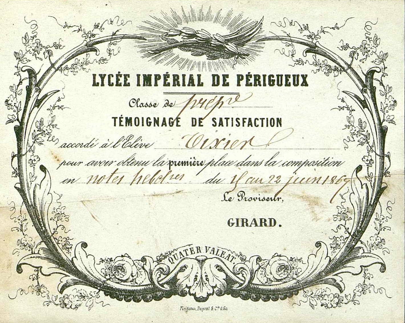 Lycée impérial de Périgueux. Classe prép[aratoi]re. Témoignage de satisfaction. 1869