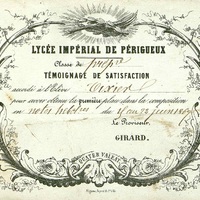 Pré imprimé illustré du Lycée impérial de Périgueux. Classe prép[aratoi]re. Témoignage de satisfaction daté de 1869accordé à l'élève Tixier pour avoir obtenu la première place dans la composition en notes ...