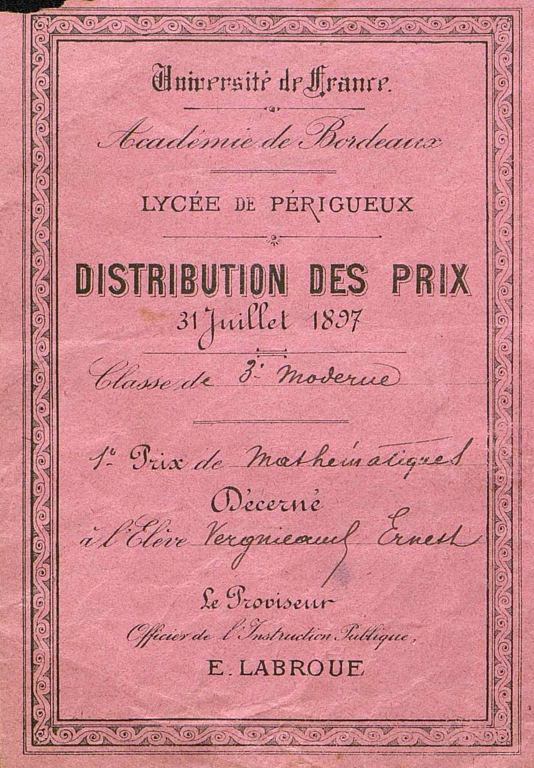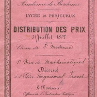 Pré-imprimé du Lycée de Périgueux : Classe de troisième Moderne. Premier prix de Mathématiques décerné à l'élève Vergnieaud Ernest