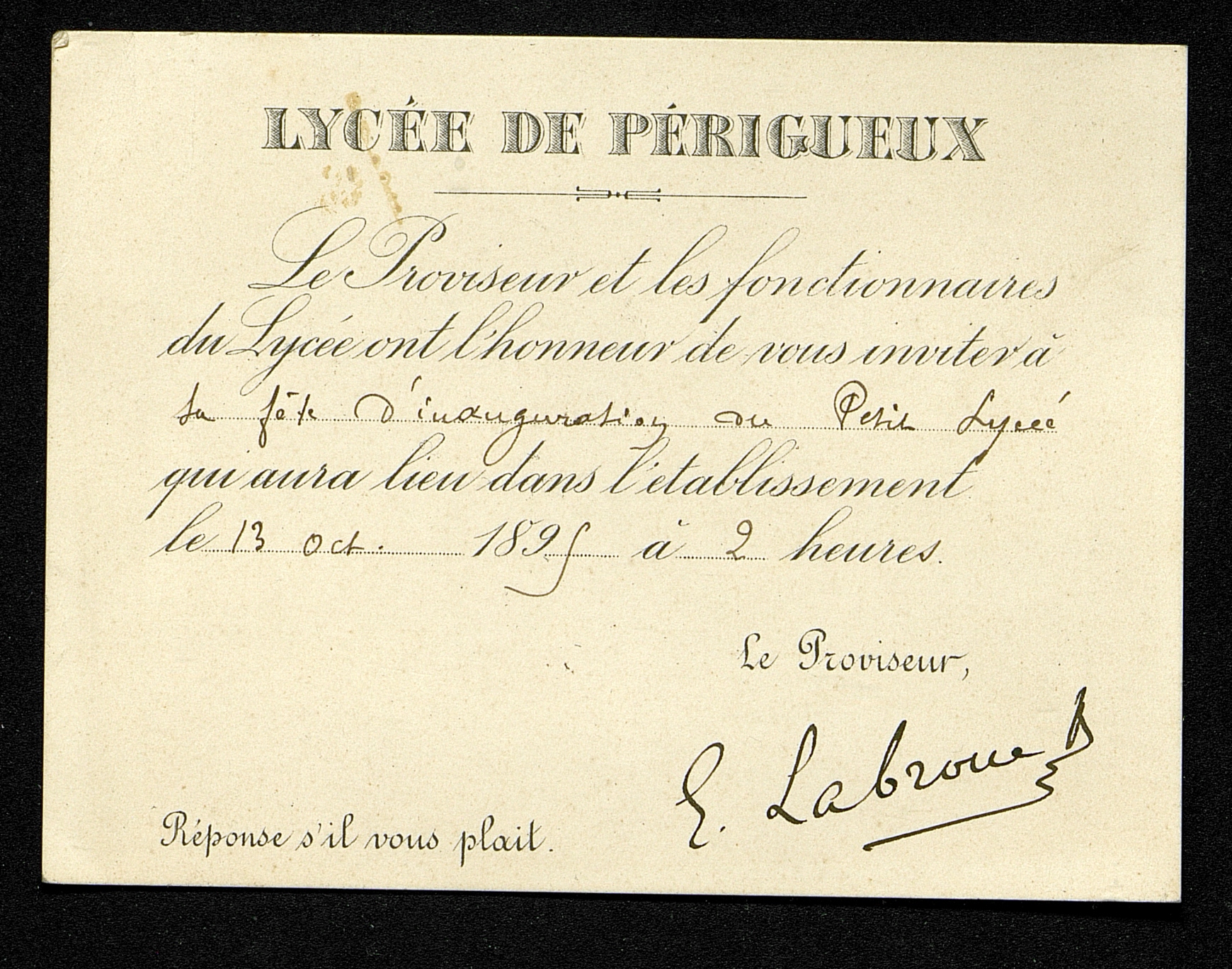 Carte pré-imprimée du Lycée de Périgueux. Carte d'invitation à la fête d'inauguration du Petit Lycée. Datée et signée.