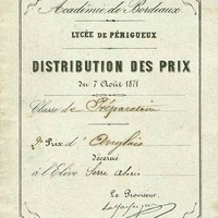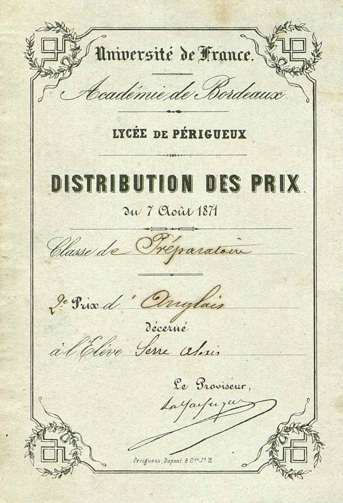 Pré-imprimé de l'Université de France. Académie de bordeaux. Lycée de Périgueux. Distribution des prix. 1871 ; Classe de Préparatoire ; Deuxième prix d'Anglais décerné à l'élève Serre Alexis.