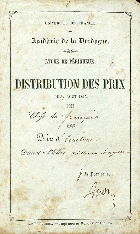 Université de France. Académie de Bordeaux. Pré-imprimé du Lycée de Périgueux. Distribution des prix. 1853. Classe de Français. Prix d'écriture décerné à l'élève Guillaume Sengeance