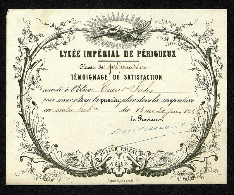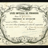Pré-imprimé illustré du Lycée impérial de Périgueux. Classe préparatoire . Témoignage de satisfaction. 1868 accordé à l'élève Tixier Jules pour avoir obtenu la première place dans la composition en notes sub[sidiair]es.