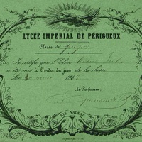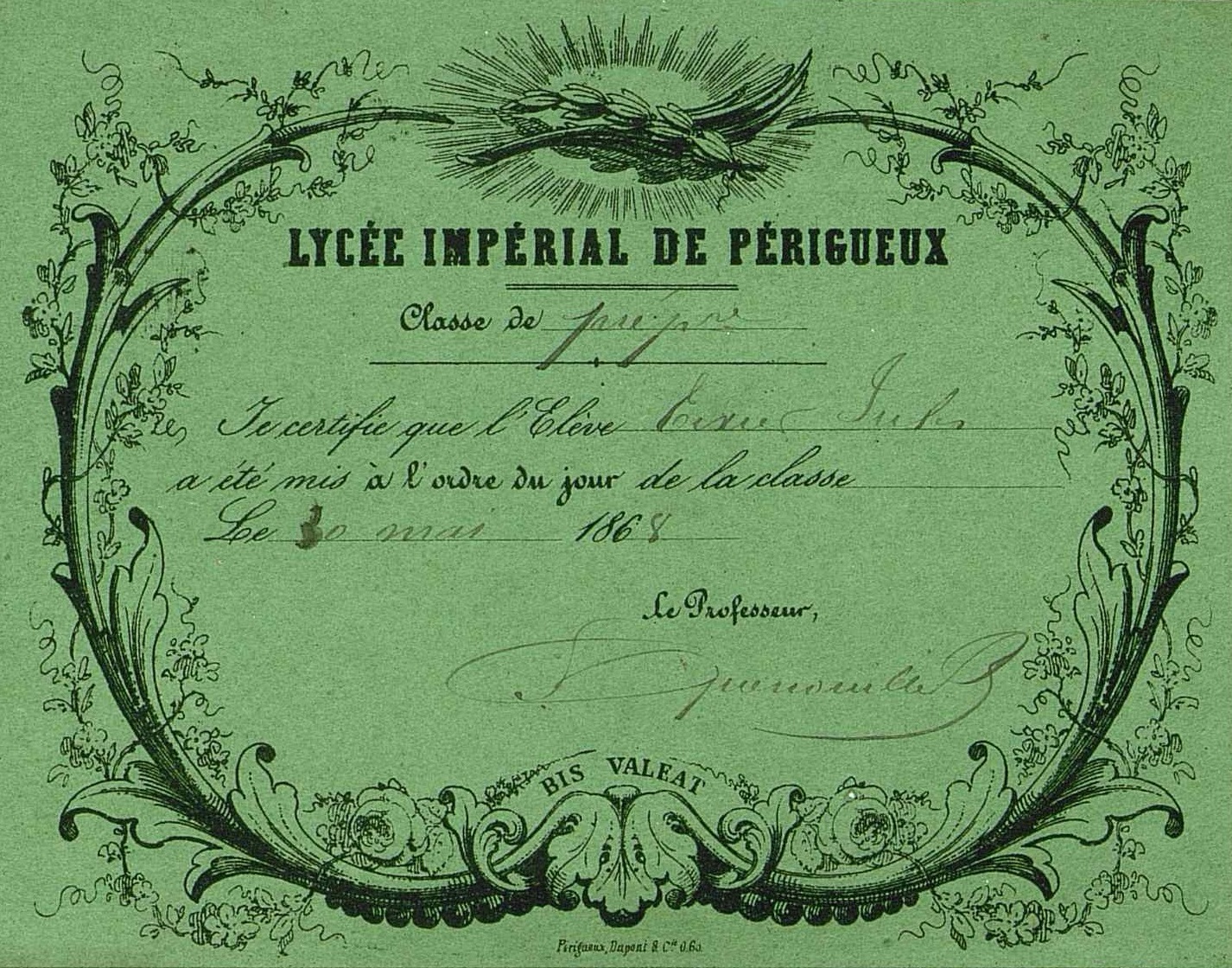 Pré-imprimé illustré du Lycée impérial de Périgueux. Classe préparatoire . témoignage de satisfaction. 1868 .Bis valeat. Je certifie sur l'honneur que l'élève Tixier Jules a été mis à l'ordre du jour de la classe