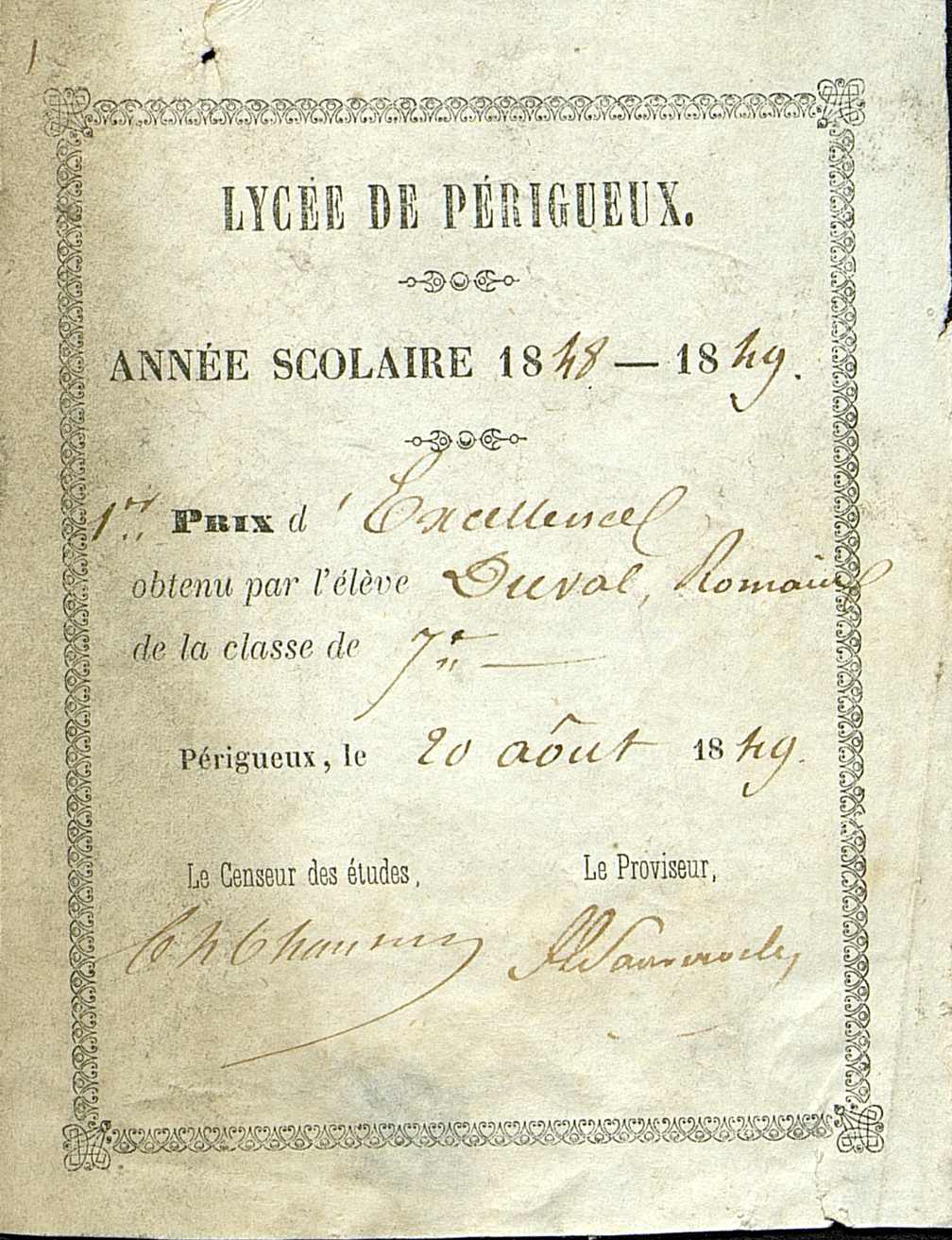 Pré-imprimé du Lycée de Périgueux. année scolaire 1848-1849. Premier prix d'excellence obtenu par l'élève Duval Romain. Classe de septième.