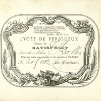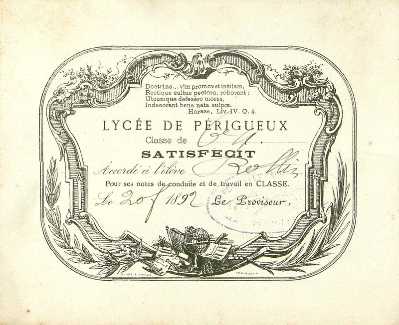 Imprimé illustré du Lycée de Périgueux. Témoignage de satisfaction. 1892. Classe de 6eme, accordé à l'élève Rollin pour ses notes de conduite et de travail en classe. Billet oblitéré.