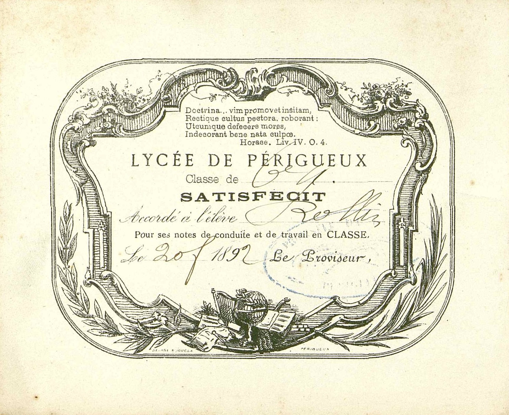 Lycée de Périgueux. Témoignage de satisfaction. 1892. Classe de 6eme.