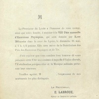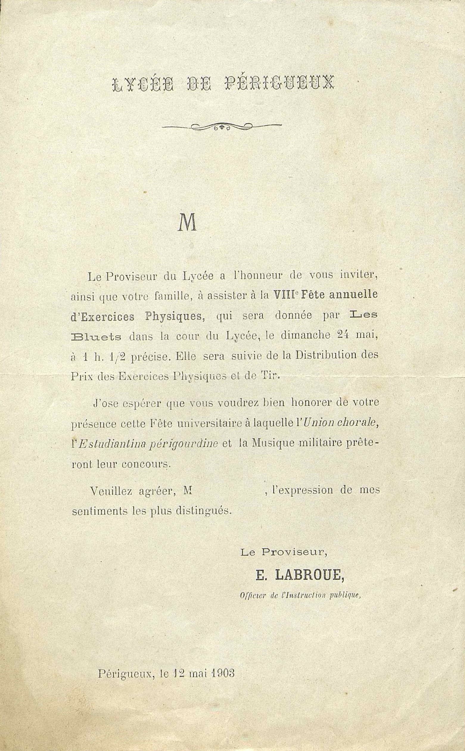 Lettre d'invitation à la huitième fête annuelle d'exercices physiques des Bluets dans la cour du lycée, le dimanche vingt-quatre mai dix-neuf cent trois à une heure et demie précise et distribution des prix., puis à la fête universitaire avec l'Union chorale, l'Estudiantina périgourdine et la Musique militaire.