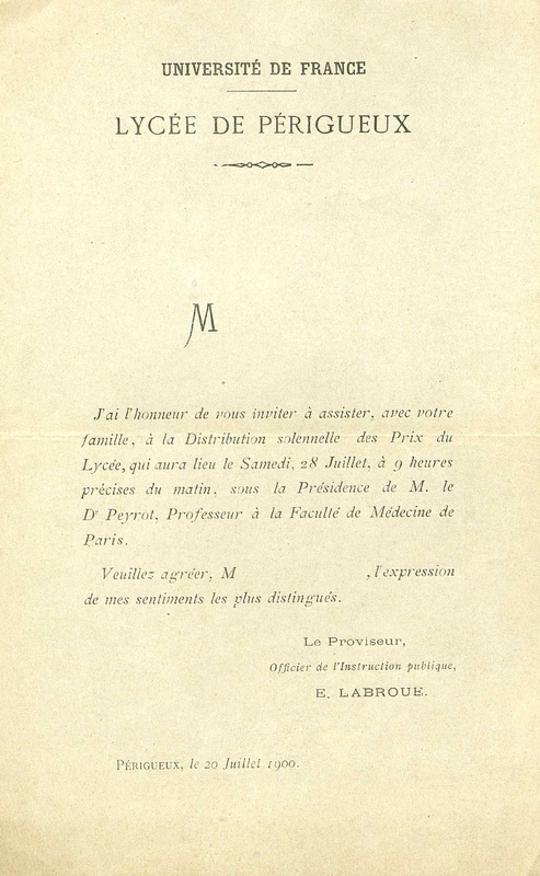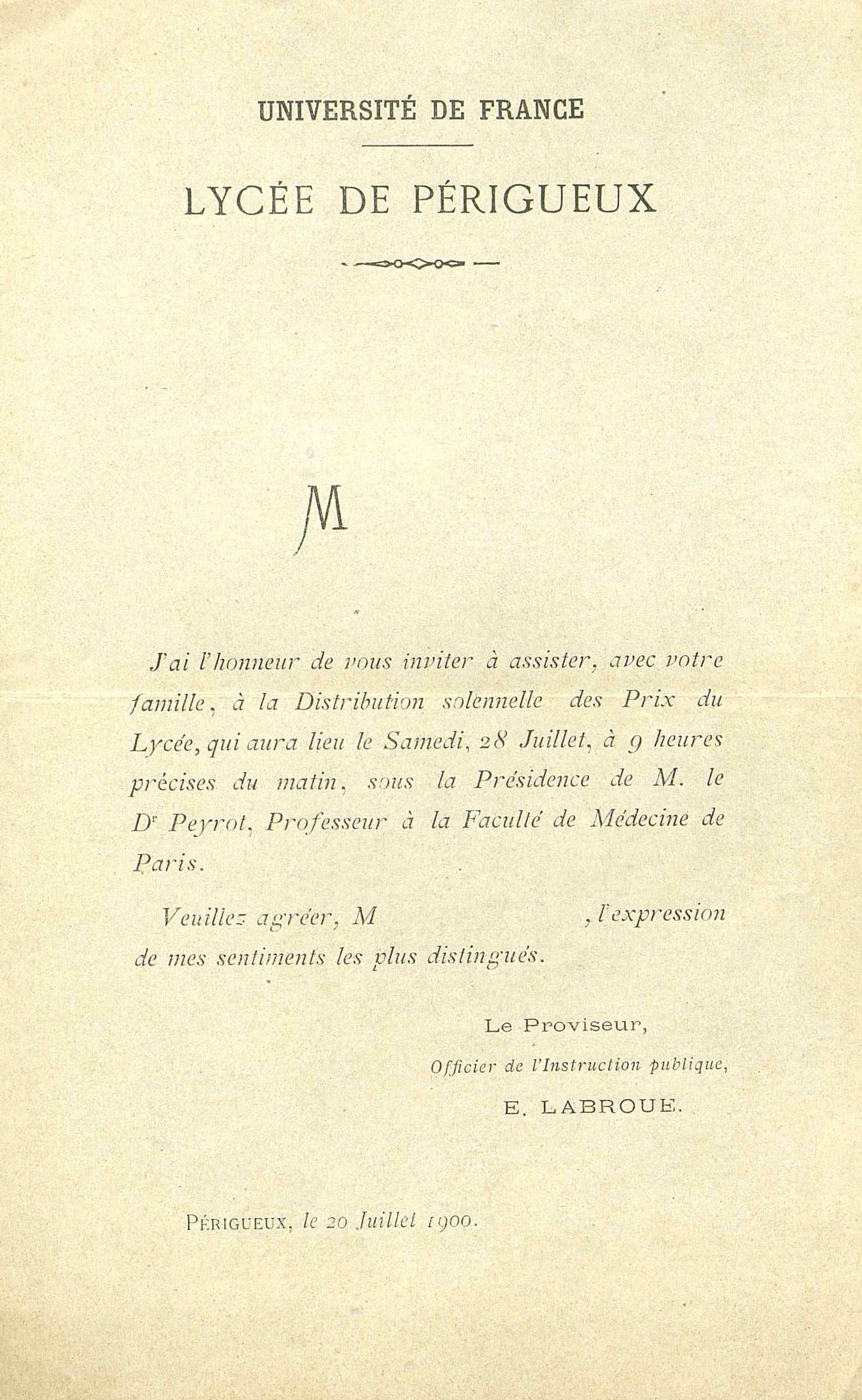 - Lettre pré-imprimée d'invitation à la distribution solennelle des prix du Lycée de Périgueux du samedi 28 juillet 1900. Lettre datée du 20 juillet 1900.