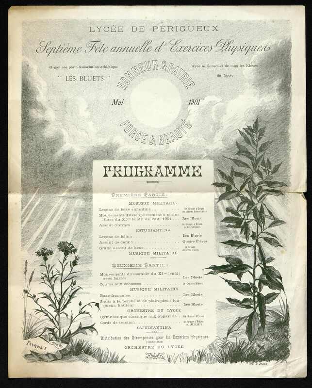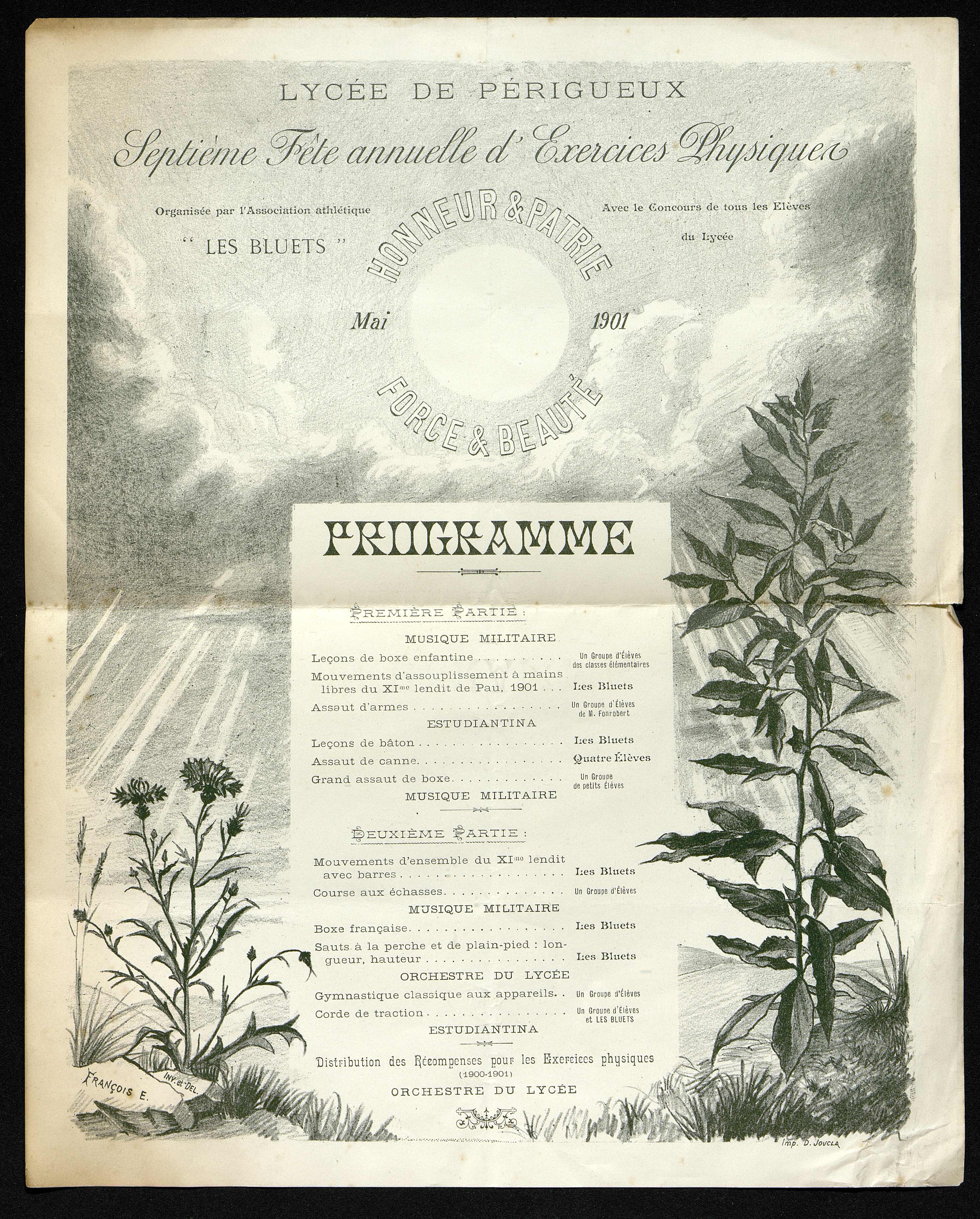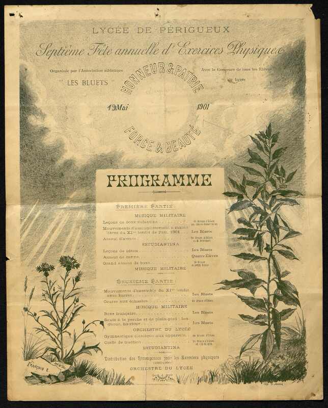 Programme de la septième fête annuelle d'exercices physiques . Lycée de Périgueux. Sur le verso de la même affiche en double mention manuscrite : Jean Roussarie aux Moulineaux.
