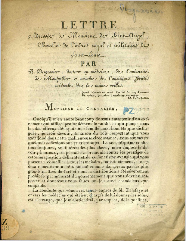 Lettre adressée à Monsieur de Saint-Angel [...] par Monsieur Desgravier [...]