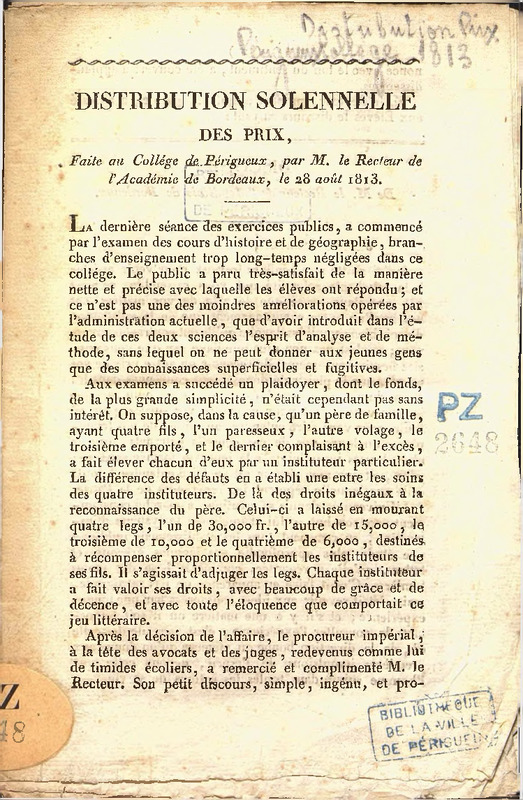 Distribution solennelle des prix faite au Collège de Périgueux [...] le 28 août 1813