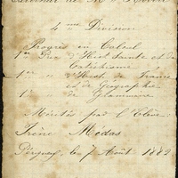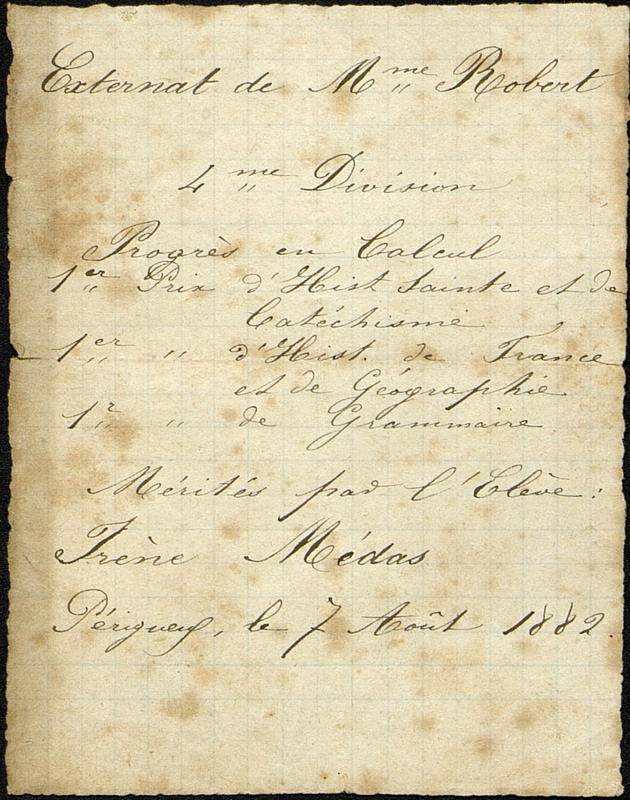 En manuscrit sur simple feuille de papier : Progrès en calcul, premier prix d'hist[oire] sainte et de catéchisme, premier prix d'histoire de France et de géographie, premier prix de grammaire mérités par l'élève à Irène Médas.