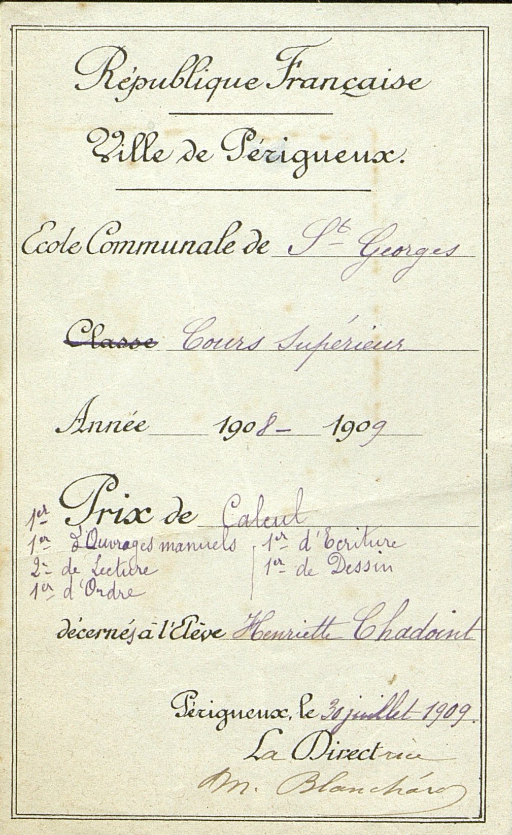 Imprimé sur lequel est porté en manuscrit : Premier prix de calcul, d'ouvrages manuels, d'écriture, de dessin, et d'ordre, deuxième prix de lecture décernés à Henriette Chadoint