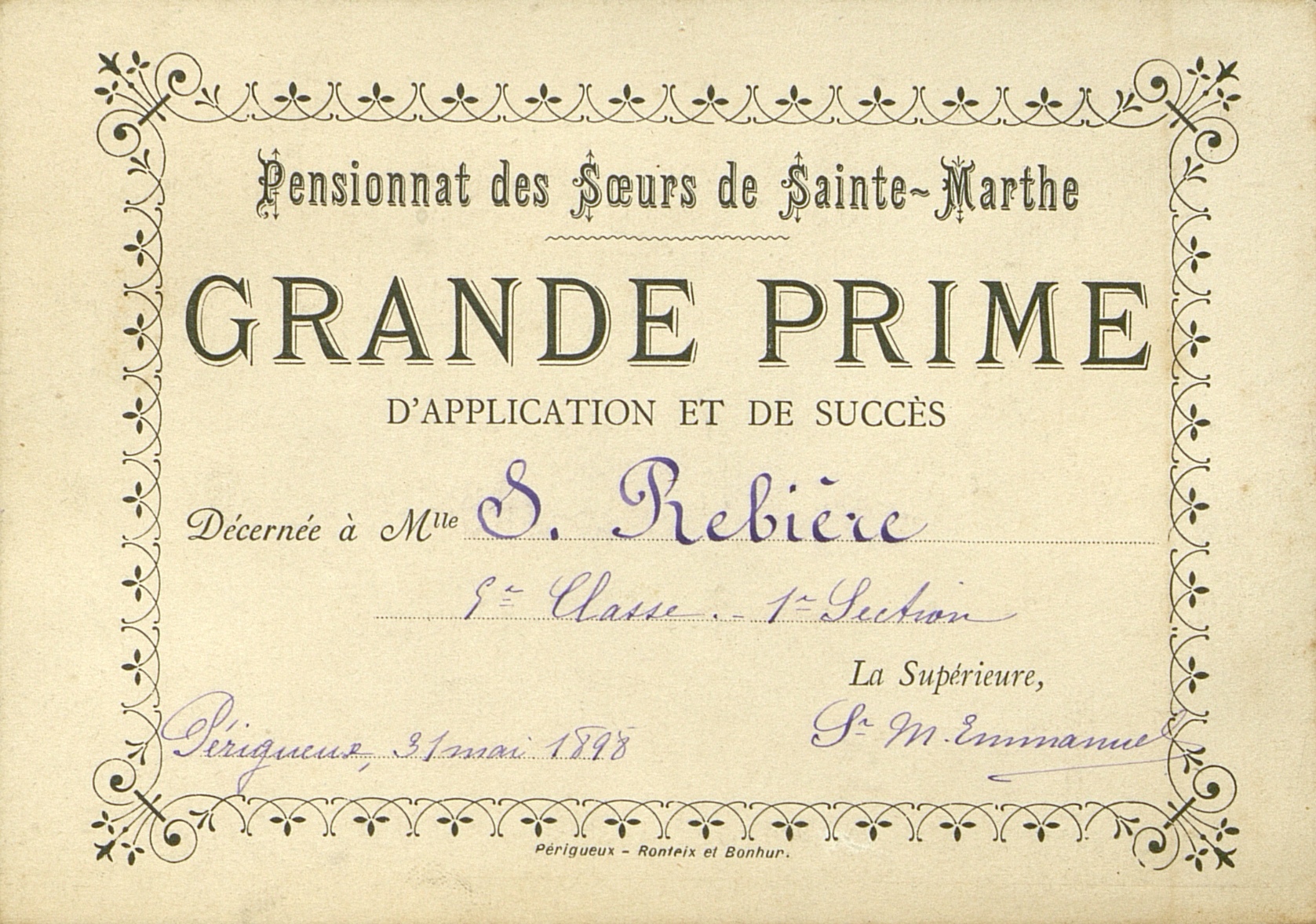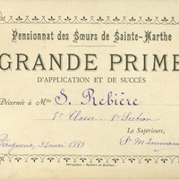 Pensionnat des Sœurs de Sainte-Marthe. Grande prime d'application et de succès décernée à Mlle S. Rebière. 5e classe, 1re section.