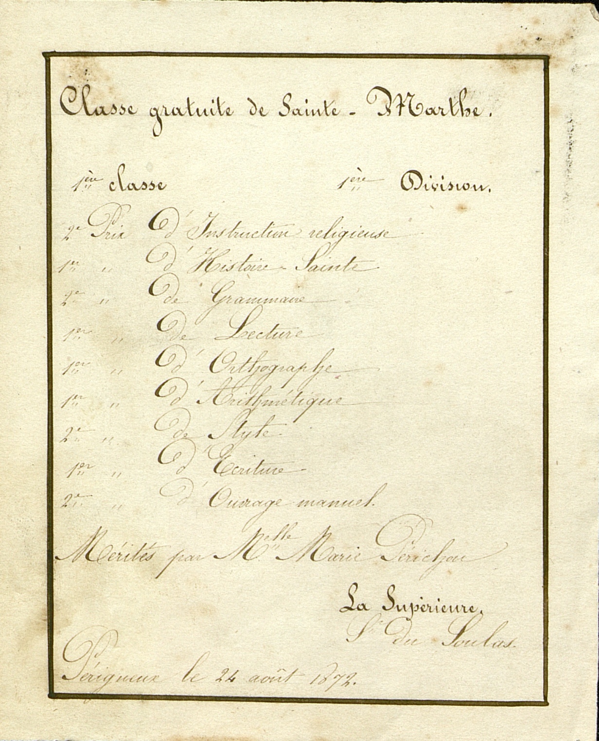 Deuxième prix d'instruction religieuse,de style, d'ouvrage manuel, premier prix de grammaire, de lecture, d'arithmétique et d'écriture mérités par Mlle Marie Périchou. Première classe, première division.