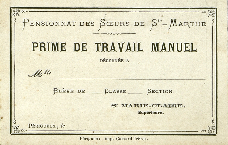 formulaire vierge concernant une prime de travail manuel émis ^par le Pensionnat des Sœurs de Sainte-Marthe.