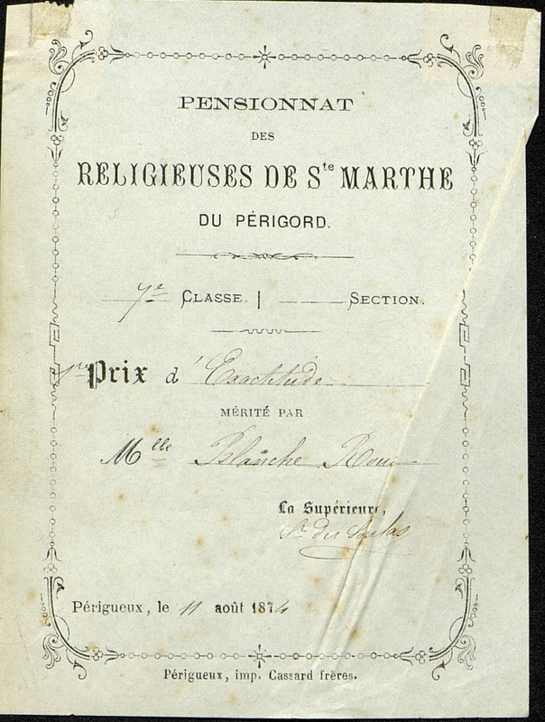 Premier prix d'exactitude mérité par Mlle Blanche Roux. Document pré-imprimé avec des mentions manuscrites.