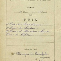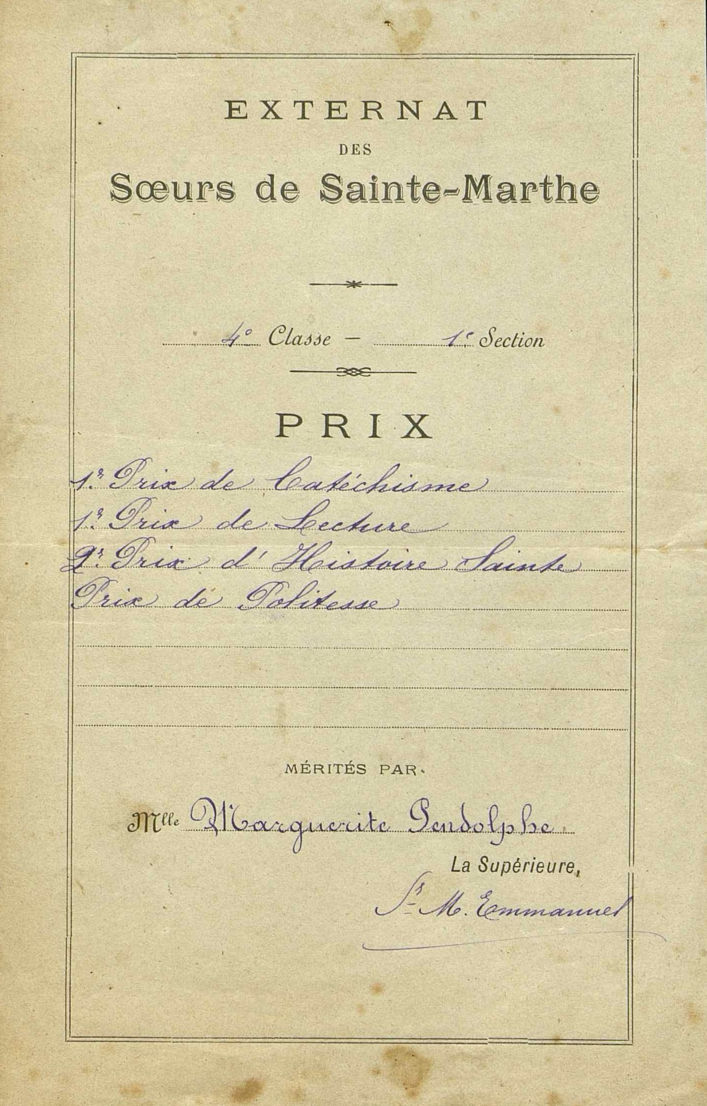 Document pré-imprimé avec ajouts manuscrits. Premiers prix de catéchisme et de lecture, deuxième prix d'histoire sainte et de politesse mérités par Mlle Marguerite Pendolphe