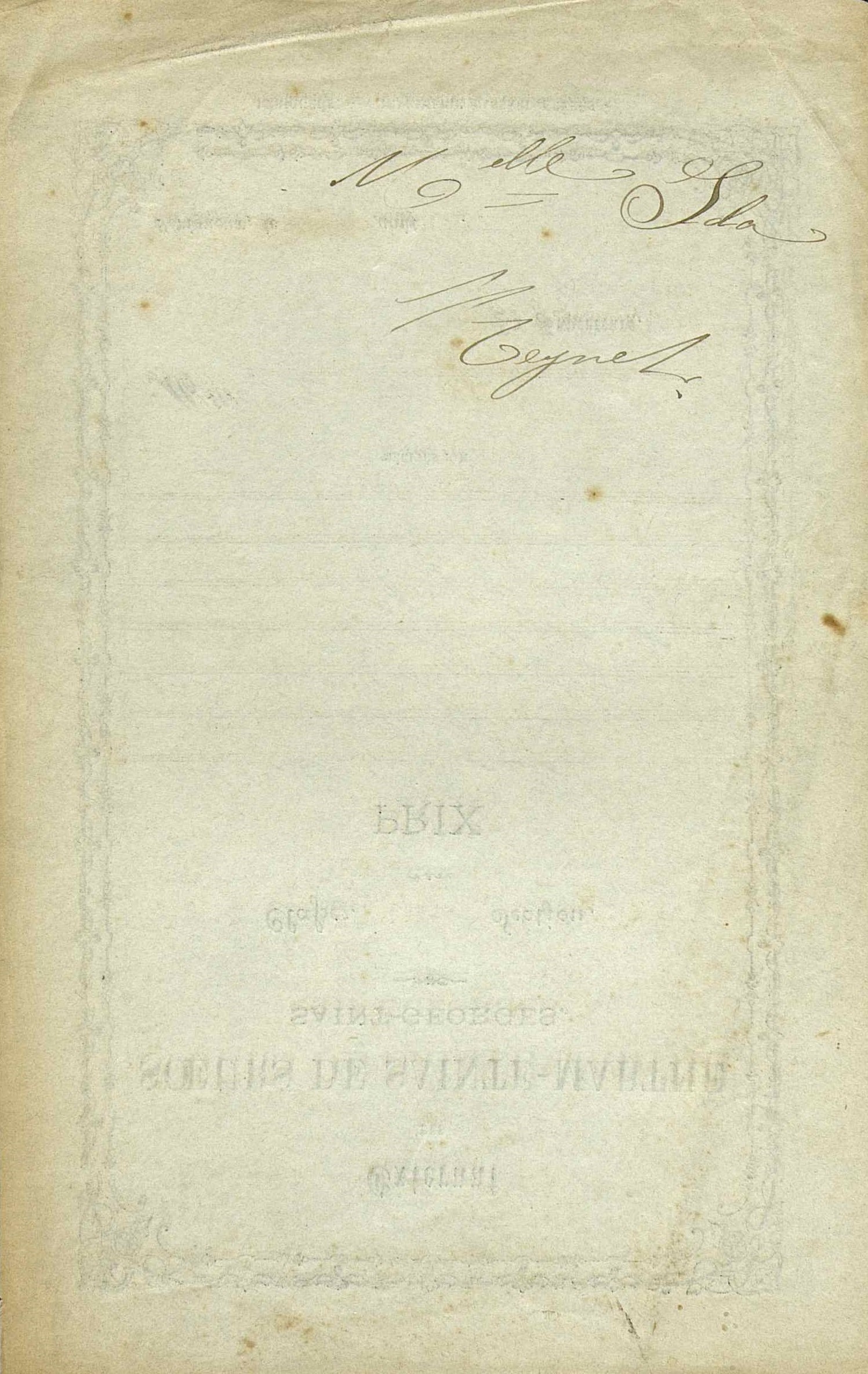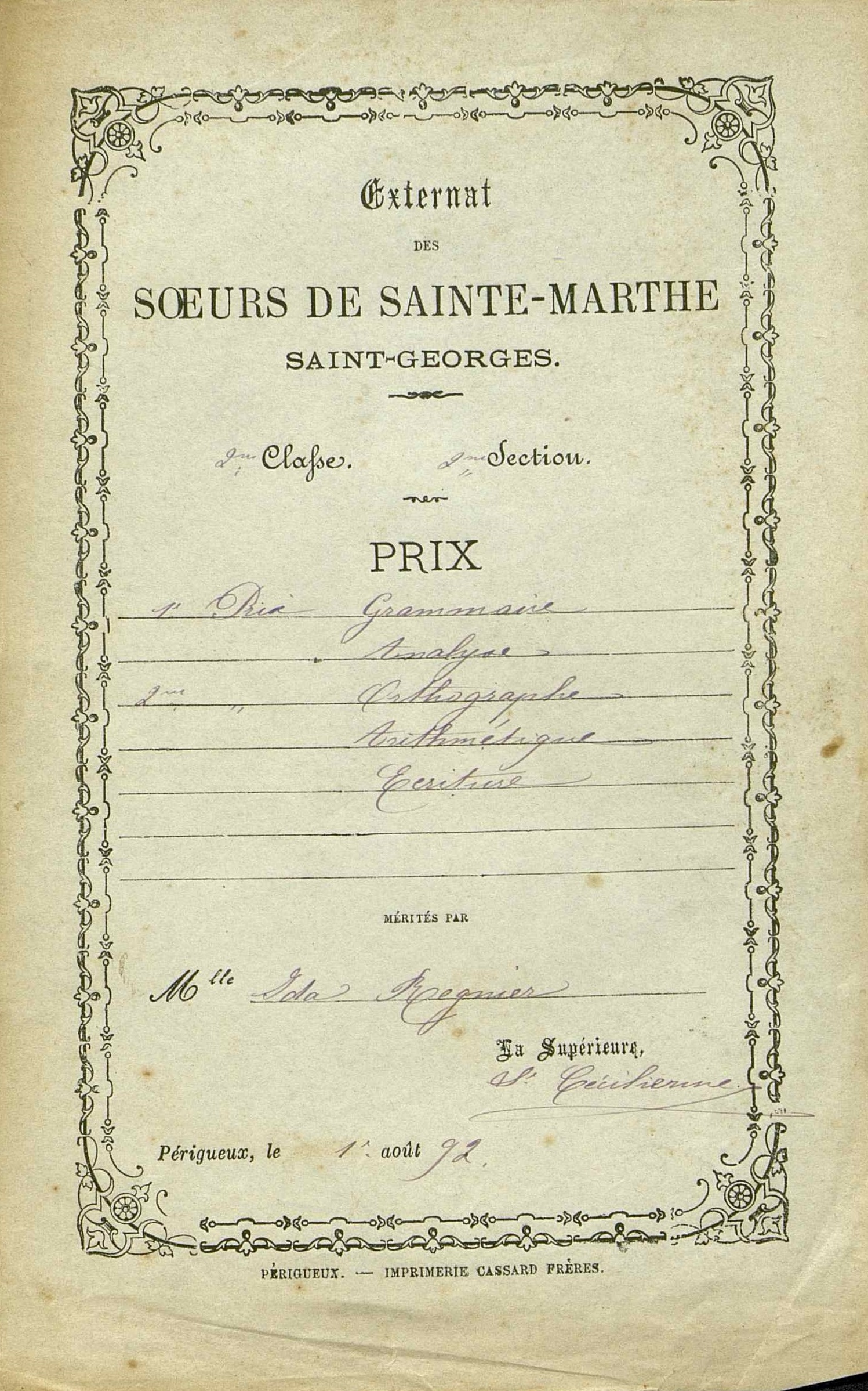 Document pré-imprimé. Premier prix de grammaire, d'analyse, deuxième prix d'orthographe, d'arithmétique et d'écriture mérités par Mlle Ida Regnier. 4me Classe. 1re section. Verso : note manuscrite : Mlle Ida Regnet.