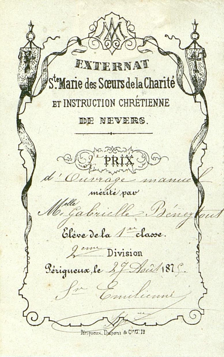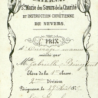 Pré-imprime à compléter de manière manuscrite. Prix d'ouvrage manuel mérité par Mlle Gabrielle Béneytout élève de la 1re classe 2éme division