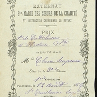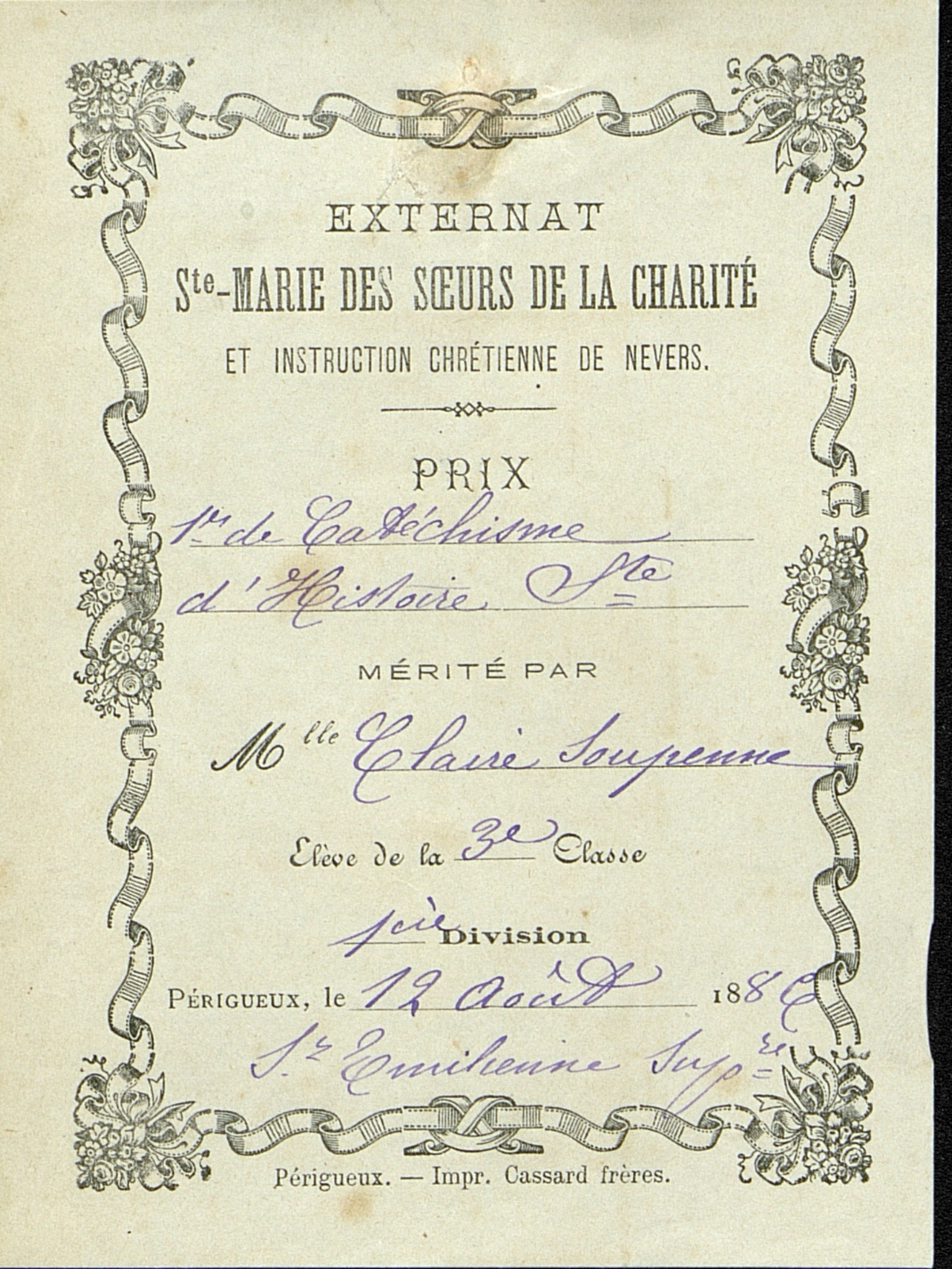 Pré-imprimé décoré de l'Externat Sainte Marie des Sœurs de la Charité et Instruction Chrétienne de Nevers. Premier prix de catéchisme et d'histoire sainte mérité par Claire Soupenne