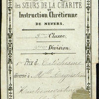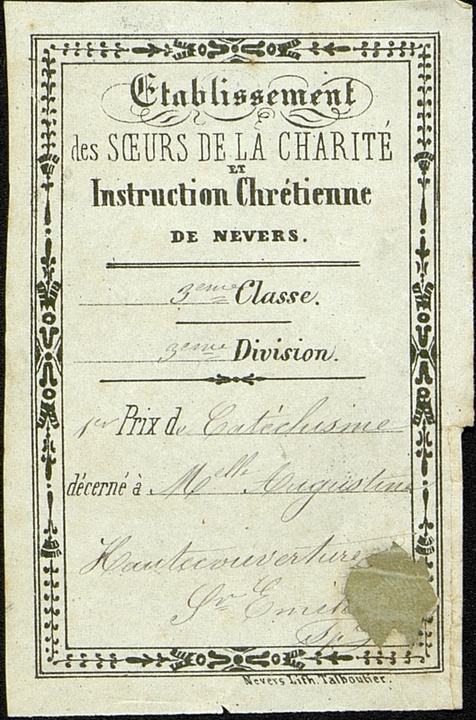 Pré-imprimé de l'Etablissement des Sœurs de la Charité et Instruction Chrétienne de Nevers. Premier prix de catéchisme décerné à Mlle Augustine Hautecouverture. Billet en mauvais état et tâché.