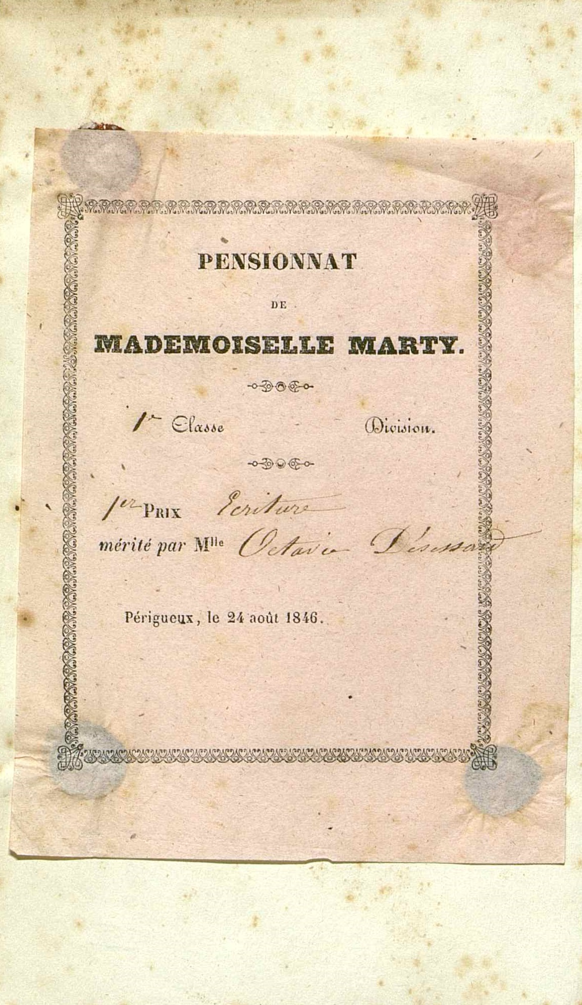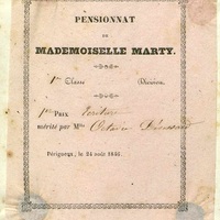 Imprimé à remplir émanant du Pensionnat de Mademoiselle Marty. Premier prix d'écriture mérité par Octavie Desissard.