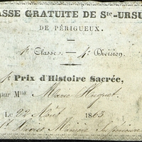 Imprimé à remplir de la Classe gratuite de S[ain]te-Ursule de Périgueux. Premier prix d'histoire sacrée mérité par Mlle Marie Huguet. Première classe, quatrième division.