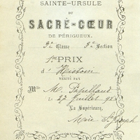 Imprimé de l'Ecole Sainte-Ursule du Sacré-Cœur de Périgueux. Premier prix d'Histoire mérité par Mlle M. Papillaud. Troisième classe, troisième section