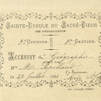 Accessit de géographie mérité par Mlle M. Papillaud de l'Ecole Sainte-Ursule du Sacré- Cœur de Périgueux. Troisième division, troisième section