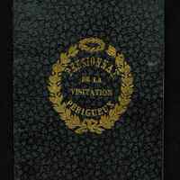 - Couverture arrachée d'ouvrage inconnu. Entre des palmes académique on lit Pensionnat de la Visitation Périgueux. Le tout en lettres dorées.