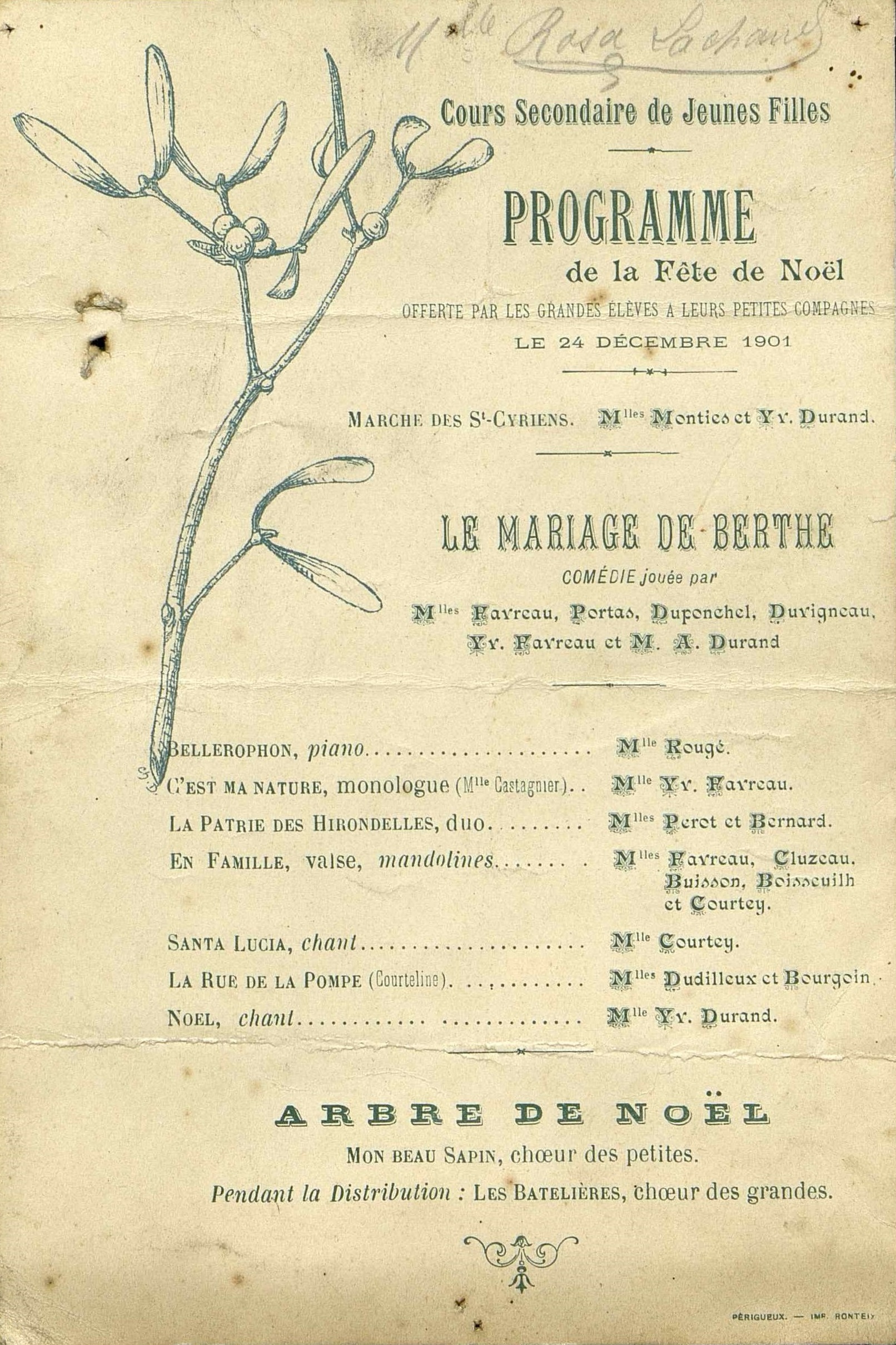 Programme de la Fête de Noël du Cours Secondaire de Jeunes filles. En manuscrit en haut on lit : Rosa Lachaud.