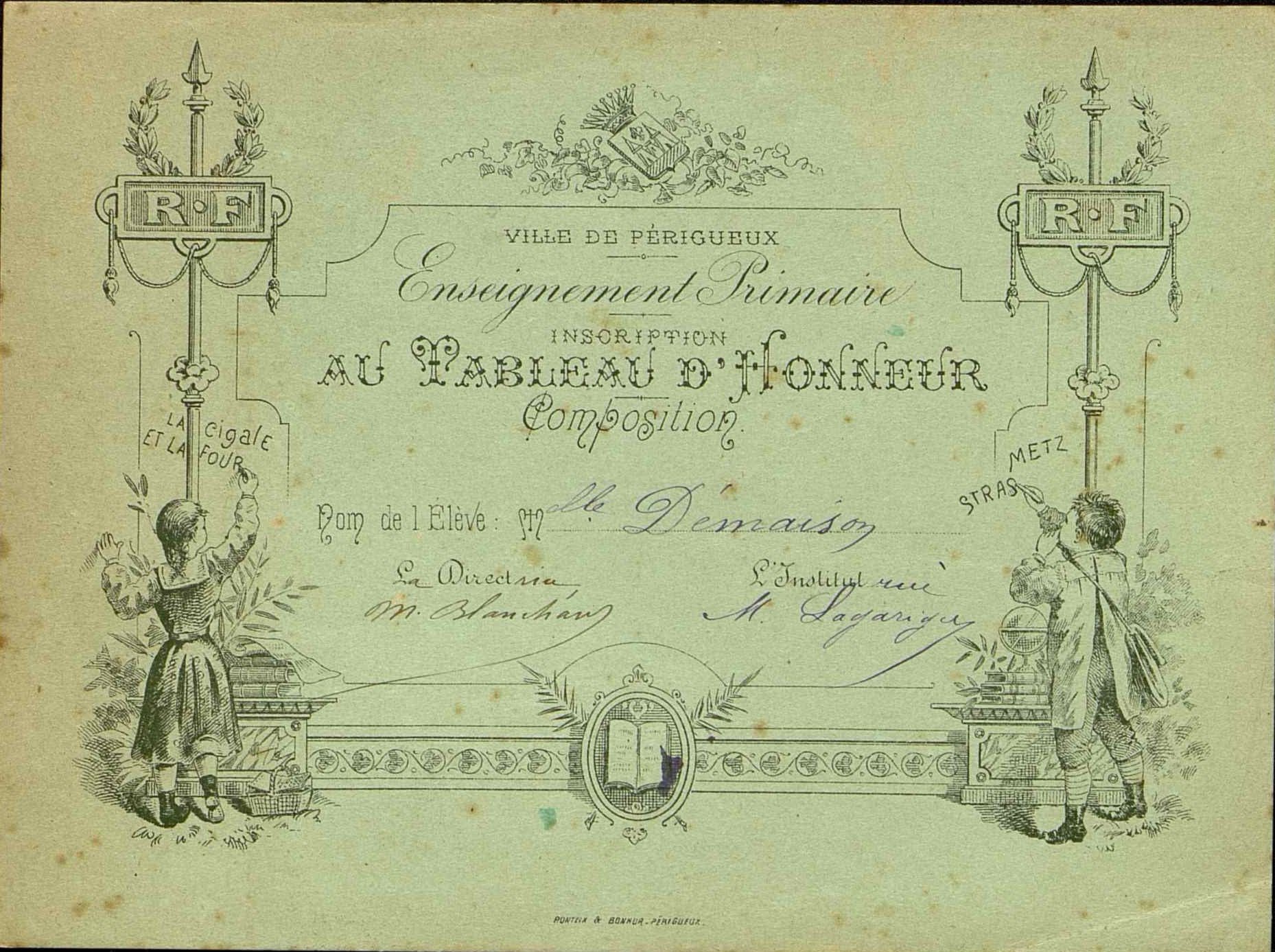- Inscription au tableau d'honneur de Composition . Nom de l'élève Mlle Démaison
