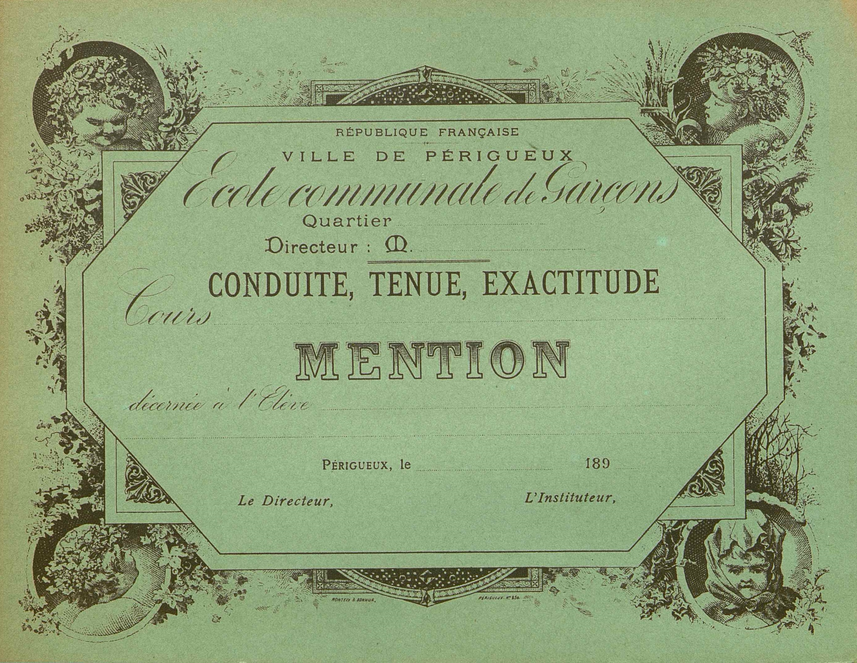 Ecole communale de garçons . Ville de Périgueux. Conduite, tenue, exactitude