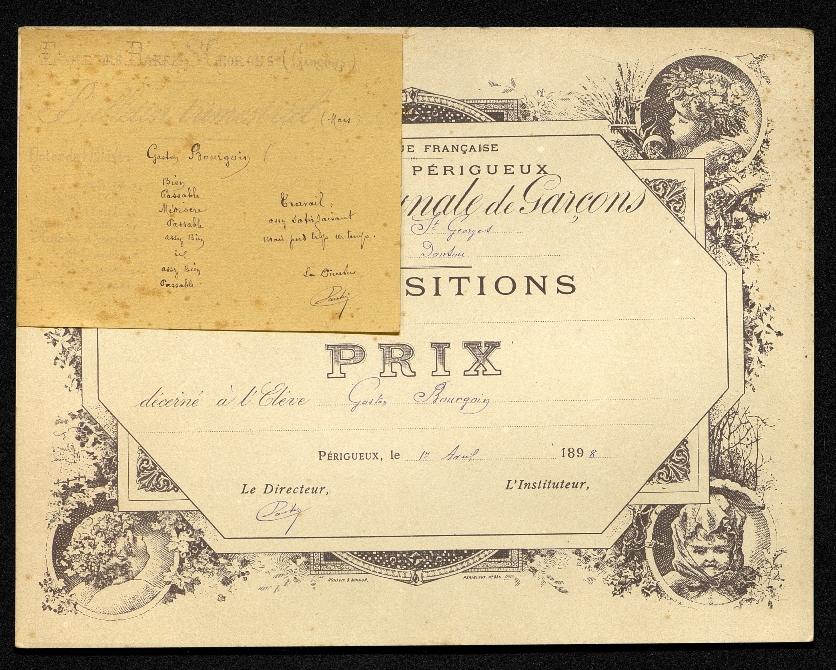 Imprimé sur lequel on a collé les observations manuscrites du directeur de l'établissement. Notes de l'élève Gaston Bourgoin. Bulletin trimestriel. Prix de Composition.